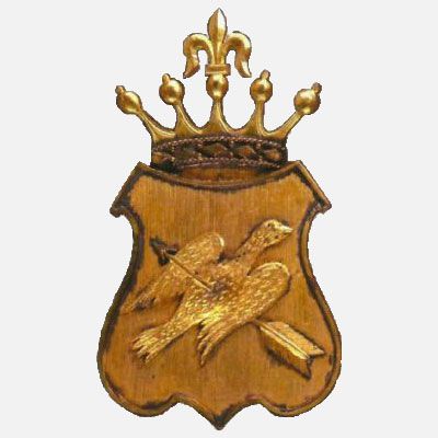 Na czerwonym tle tarczy, wzlatujący w prawo biały gołąb przebity strzałą ze złotym grotem i lotką. Herb zwieńczony lilią burbońską.